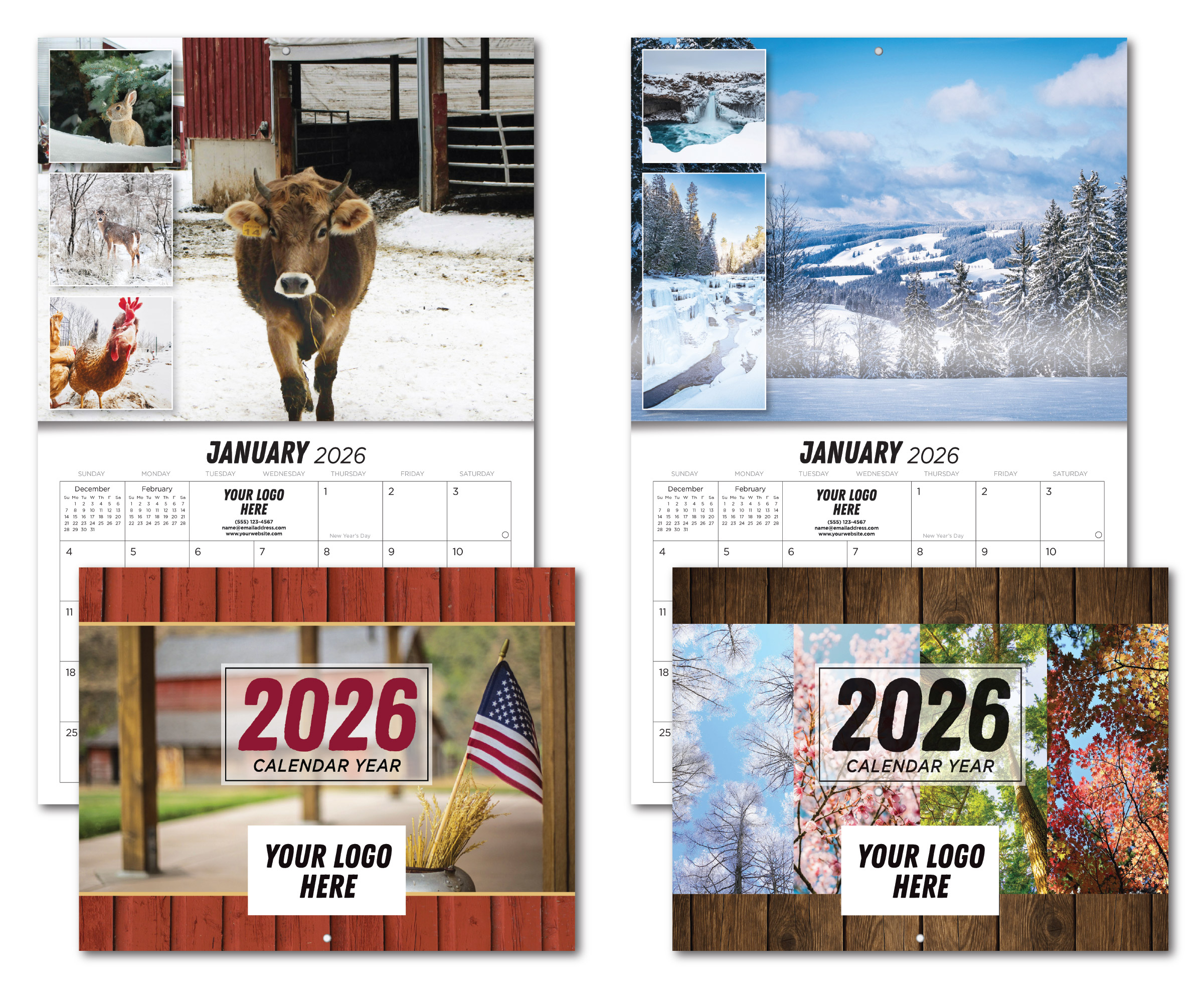 Printed on premium stock with crisp color and professional finishing, each calendar is built to look sharp from January through December. We have created two templates for 2026; a farm theme and a scenic theme. The cover will feature your full-color logo, and the inside pages include your full-color logo and contact information for consistent branding throughout the year.
