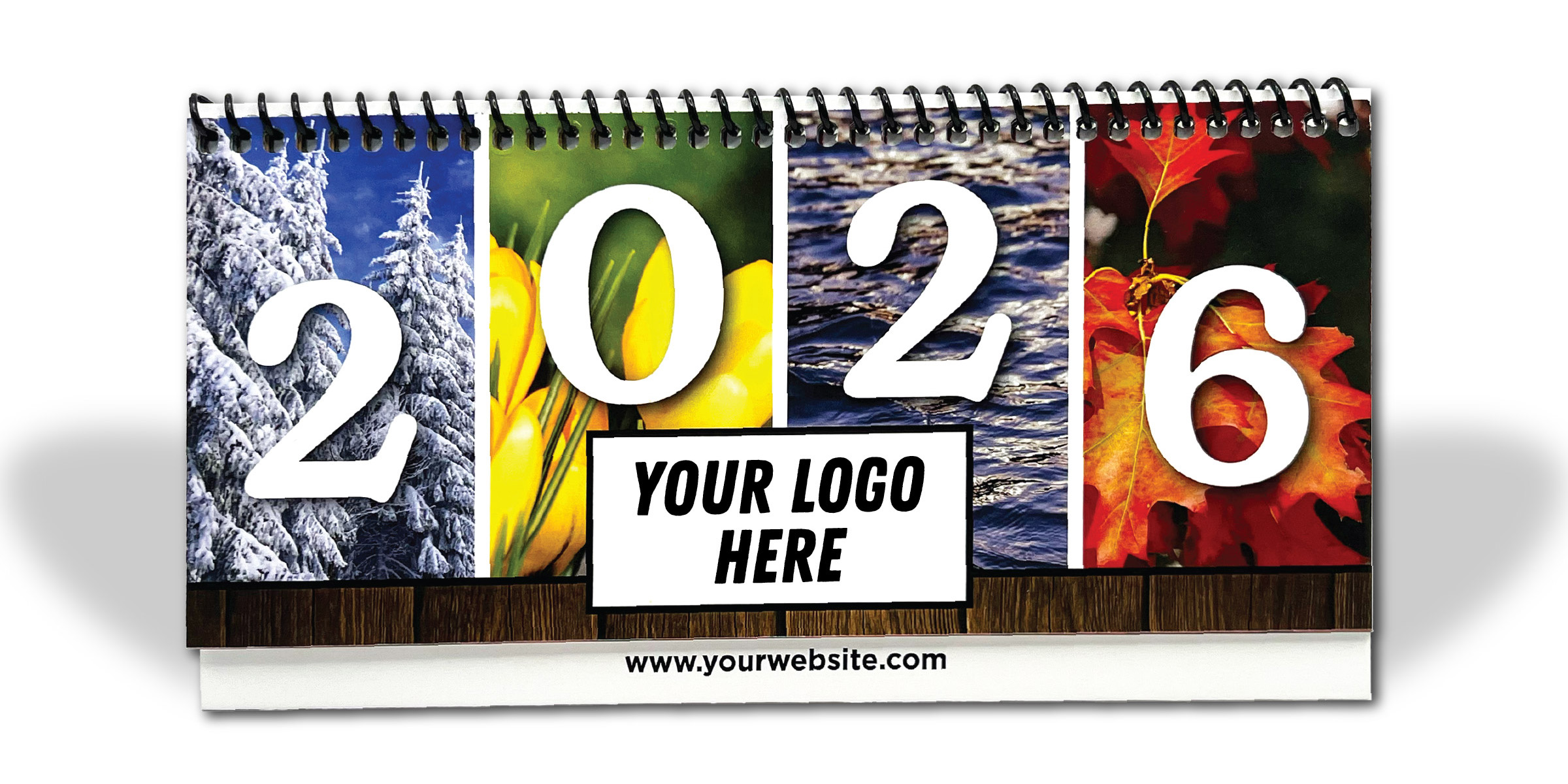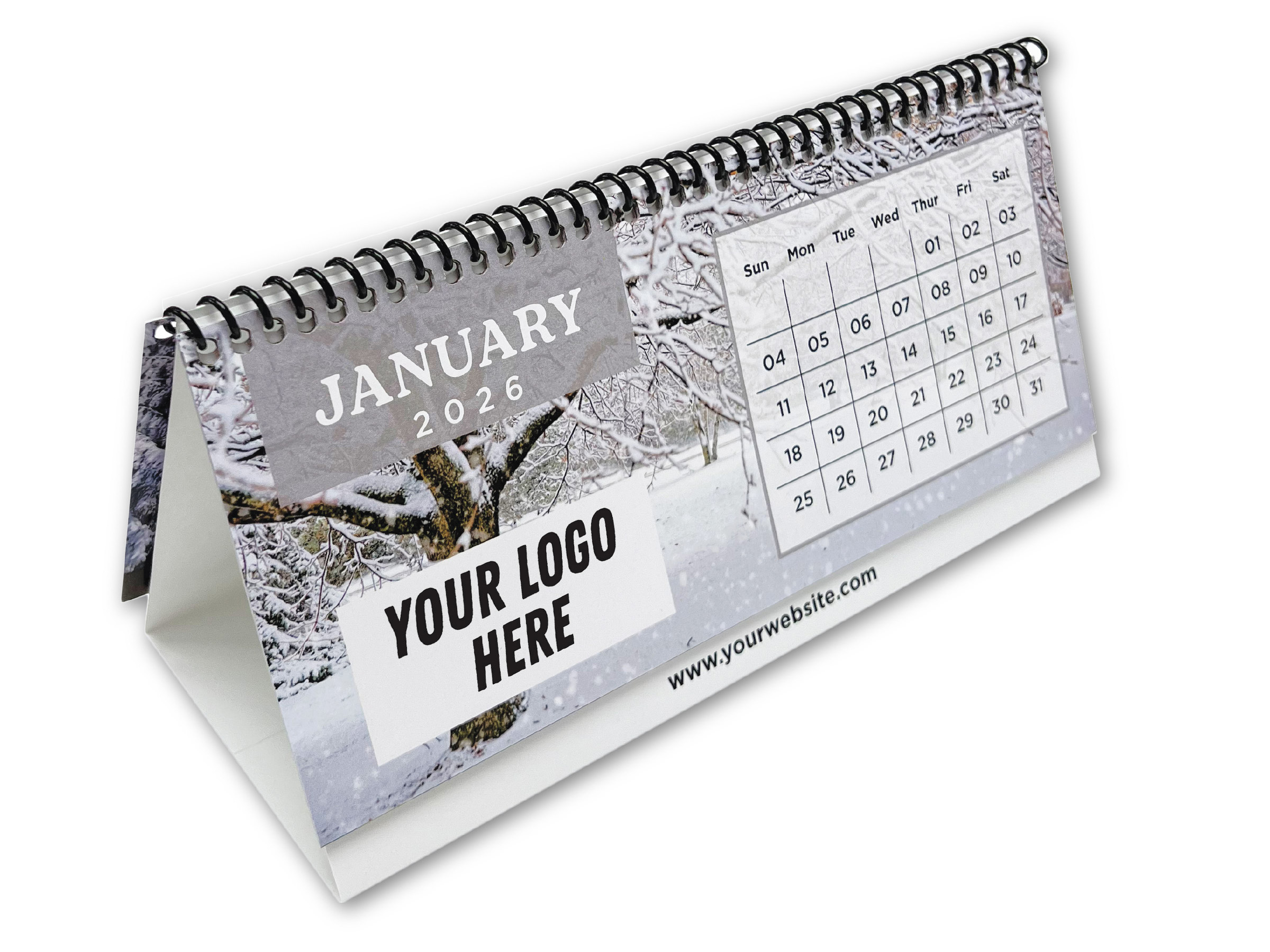 Stay top of mind all year with this handy flip-top desk calendar! Each month (plus the cover) features your full-color logo, and your website is printed along the bottom of the table tent for year-round visibility. When opened, the monthly view is visible from both sides, making it perfect for front counters, cashier stations, and desks. The spiral-bound tent design ships flat for easy storage.